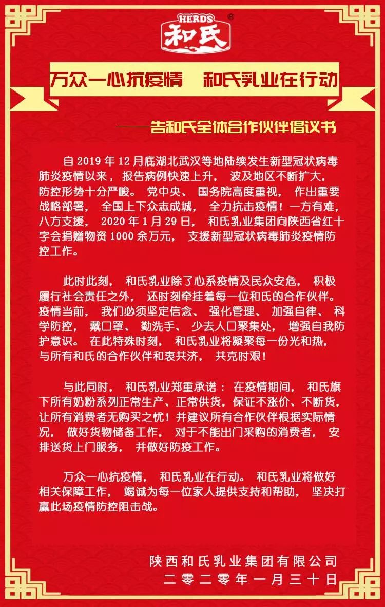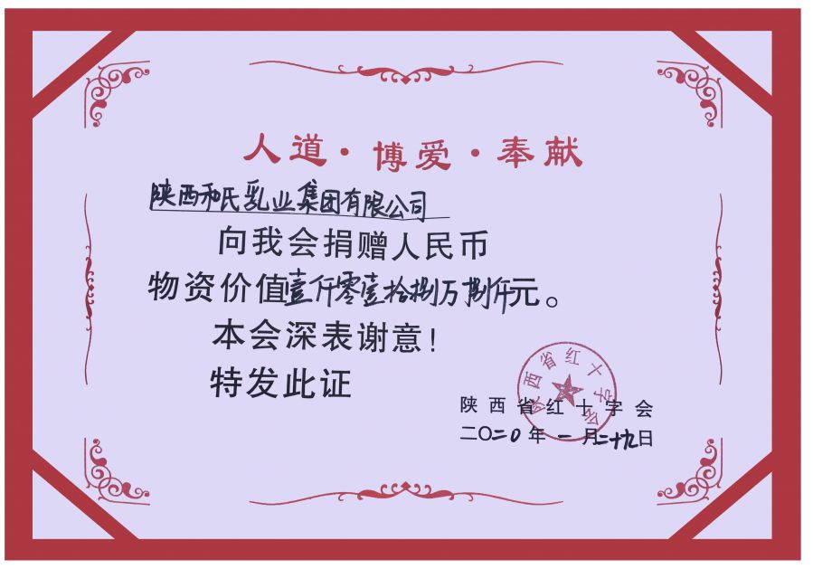 2020的開局之年,格外特別。新型冠狀病毒肺炎疫情的大爆發徹底改變了這個新年原有的模樣。此時此刻,疫情依舊肆虐,報告病例持續上升,防控形勢十分嚴峻。舉國上下,萬眾一心,眾志成城,共克時艱! 一方有難,八方支援,疫情當前,刻不容緩。和氏作為已成立28年之久的民族知名乳企,本著高度的社會責任感和使命感,緊急向陜西省紅十字會捐贈物資1000余萬元。時刻關注疫情動態,關心一線醫務工作者、公安民警、感染者和集中隔離人員等,全力支援新型冠狀病毒肺炎疫情防控工作。