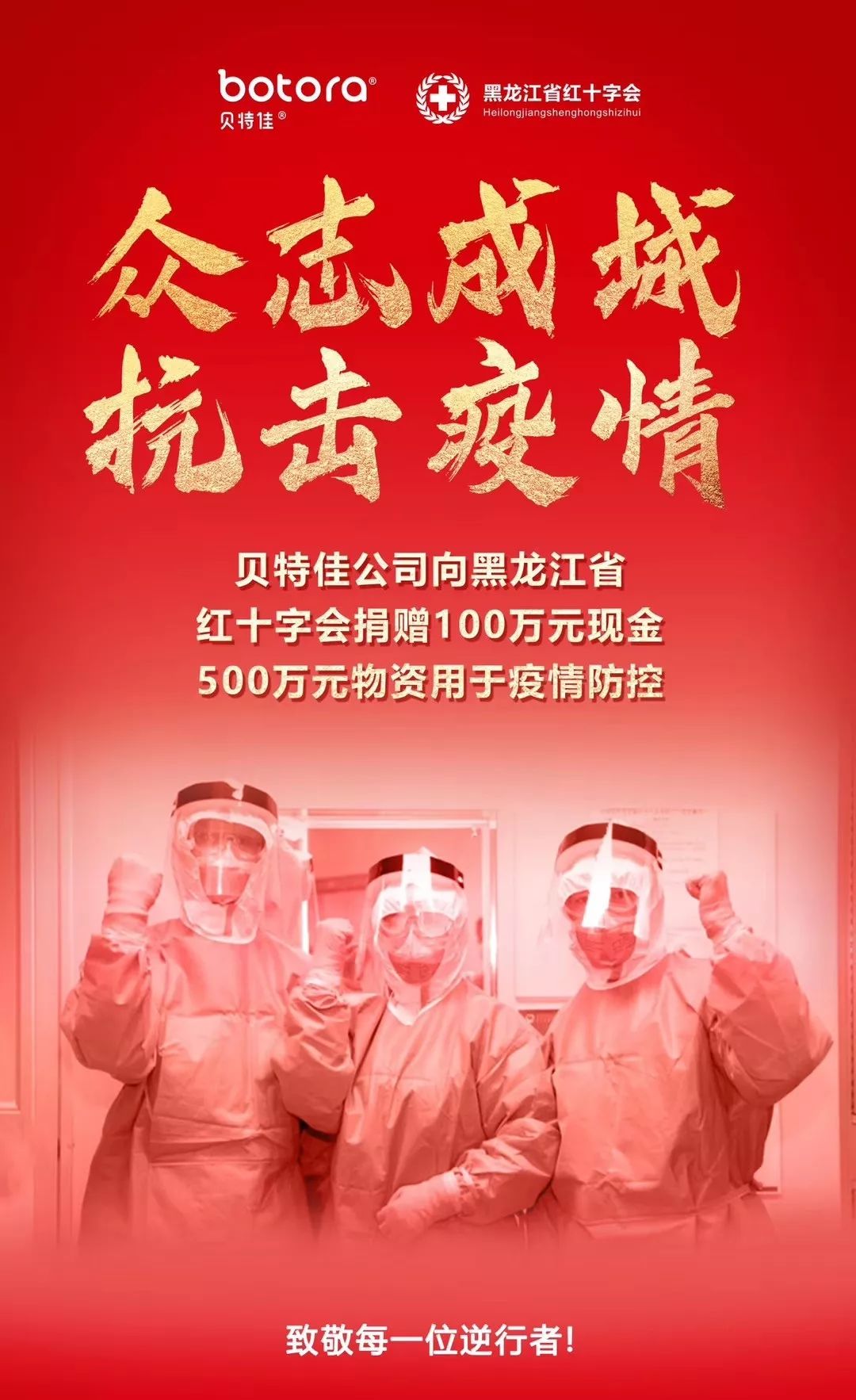 1月30日,貝特佳公司向黑龍江省紅十字會捐贈了100萬元現金和500萬元物資,用于疫情防控,致敬逆行者。 a2