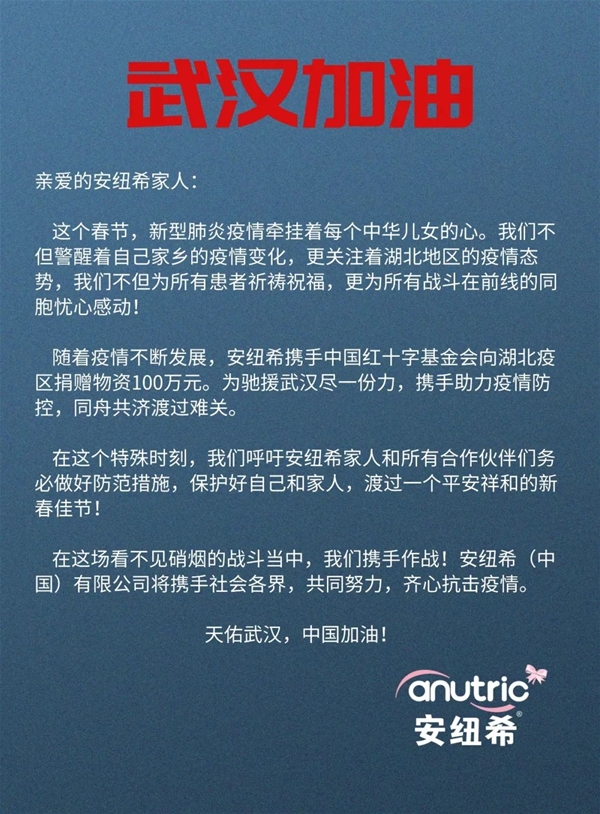字字真誠的信件中,有安紐希對湖北同胞的眷注,更有對每一個中國人的健康倡議,希望千家萬戶共同筑起一道健康的壁壘,眾志成城,戰勝疫情。因為這一次疫情防控工作,早已不是一個省市的責任,而是舉國上下每一個人的戰斗。 “創新、誠信、精益、感恩”,是安紐希品牌從創建之初就始終秉承的理念。小到帶動當地就業、經濟發展,大到投身國家公益事業等,安紐希始終義不容辭。每一天疫情發展的數字都觸目驚心,在這危難時刻,我們更會視社會責任為己任。 正如春晚《眾志成城 抗擊肺炎》節目所說,在這場看不見硝煙的戰斗當中,我們一起守護,我們一定勝利。愛是橋梁,幫我們過關。 安紐希從事的嬰幼兒奶粉事業是民族的事業、是良心的事業、是愛的事業。讓中國媽媽們放心,是我們的責任。在這個特殊的時刻,即使病毒肆虐,但中國寶寶新鮮、健康、安全的口糧不能斷! 此次疫情急發,安紐希更加嚴苛地對生產、運輸、物流配送等各個環節進行管控和安全運營,嚴格進行消毒和無菌處理,確保每一罐奶粉能夠及時、安全地運送至媽媽和寶寶們的手中。 2020年的春節 顯得格外不同 新型冠狀病毒依然在牽動每個人的心 但也有越來越多的光 正在從裂縫之中照了進來 帶給我們生生不息的希望 疫情無情人有情 安紐希希望盡自己的綿薄之力 讓一線的醫務人員沒有顧慮地前進 讓這一場肆虐的疫情盡快得到遏制 希望每個人也和安紐希一起守護健康 所有人的努力, 一定會匯成冉冉發光的星火 最終 戰勝恐懼,戰勝疫情! 武漢挺住!中國加油! |