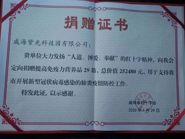 面對(duì)疫情蔓延全國(guó)的嚴(yán)峻形勢(shì),威海紫光立即行動(dòng),1月29日,向威海紅十字會(huì)捐贈(zèng)價(jià)值25萬(wàn)多元用于提高免疫力的營(yíng)養(yǎng)保健品。