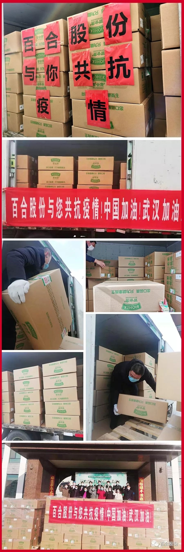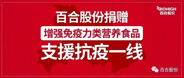 1月29日,威海百合生物技術股份有限公司通過威海市紅十字會(威海市慈善總會)捐贈50余萬元增強免疫力類的營養保健食品(涵蓋蛋白粉、維生素C等),為抗擊新冠肺炎疫情的醫護人員們提供免疫保障與營養需求。