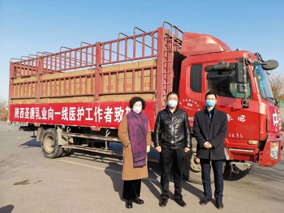 在疫情的非常時期、防控的關鍵時期,圣唐乳業的相關領導婉拒了省紅十字會組織的捐贈儀式,爭分奪秒連夜裝運,所捐贈物品直接裝車運輸。民建陜西省委會副主委惠曙光,政協渭南市副主席、民建渭南市委會主委劉巧蓮以及陜西省紅十字會相關領導現場檢查并監督裝運,確保以最快的速度送到最前線醫護人員手中!滿載著圣唐300名員工愛心的物資急馳西安,為白衣天使提供營養補給,提高自身抵抗力,以實際行動致敬最美逆行者,彰顯圣唐乳業的家國情懷和社會擔當。