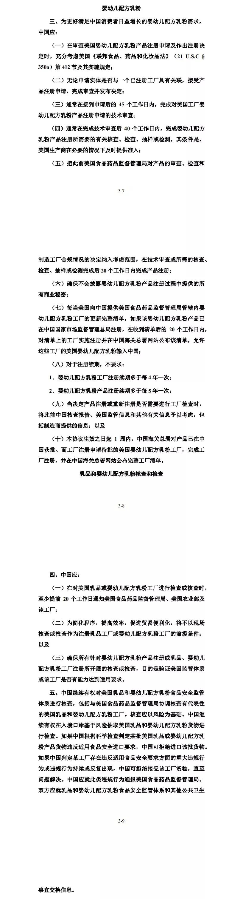 在擴大開放戰略下,中國消費市場不斷開放,以個性化、多元化、品質化為代表的消費升級趨勢在中國消費者中持續發酵,進口消費正成為消費升級的重要表現。其中母嬰品類已經成為跨境購第二大類目,嬰幼兒配方奶粉更是其權重品類。 日前,中美第一階段經貿協議文本已達成一致,其中關于嬰配粉進口的章節主要是兩大條,涉及美國嬰配粉進口工廠、產品注冊以及監管檢查兩大方面的內容。同時雙方達成一致,美方將履行分階段取消對華產品加征關稅的相關承諾,實現加征關稅由升到降的轉變。 具體而言,從注冊上看,一方面中國在審查美國嬰配粉工廠的的注冊時,要考慮到美方的法律規定以及對產品、工廠的審查;另一方面是對于注冊續期,不要求嬰配粉工廠注冊續期多于每 4 年一次;嬰配粉產品注冊續期多于每 5 年一次;最后則是45個工作日內完成審核,并在中國海關總署網站公布,另外確保不會披露產品注冊過程中提供的所有商業秘密。 關于嬰配粉核查和檢查,一方面要提前通知美國食品藥品監督管理局、美國農業部及該工廠;另一方便要簡化程序,提高效率。 同時中國有權在入境口岸抽檢嬰配粉,來判定是否符合入關要求。如果中國判定定某工廠存在違反適用食品安全要求方面的重大違規行為或違規行為持續或反復出現,可拒絕接受該工廠貨物,直至問題解決。中美雙方應就乳品和嬰幼兒配方乳粉食品安全監管體系和其他公共衛生事宜交換信息。 關于中美第一階段經貿協議的嬰配粉章節