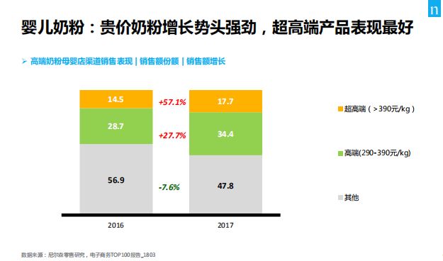 出生率趨勢(shì)向下,母嬰行業(yè)主要驅(qū)動(dòng)力由人口紅利轉(zhuǎn)為消費(fèi)升級(jí),主要體現(xiàn)為產(chǎn)品品質(zhì)化、需求個(gè)性化、內(nèi)容專(zhuān)業(yè)化。奶粉作為母嬰消費(fèi)核心品類(lèi),縱觀近兩年來(lái)行業(yè)發(fā)展動(dòng)態(tài),品牌高端化趨勢(shì)愈加明顯。據(jù)AC尼爾森數(shù)據(jù)顯示,近兩年來(lái),貴價(jià)奶粉增長(zhǎng)勢(shì)頭強(qiáng)勁,超高端品類(lèi)表現(xiàn)最好,預(yù)計(jì)未來(lái)3至5年,中高檔產(chǎn)品約占70—80%的市場(chǎng)份額。從用戶(hù)角度,目前嬰幼兒奶粉市場(chǎng)主力消費(fèi)者向85、90后新生代父母過(guò)渡,其品牌意識(shí)和購(gòu)買(mǎi)力更強(qiáng),對(duì)價(jià)格的敏感性下降,更加注重產(chǎn)品品質(zhì)與喂養(yǎng)精細(xì)化。