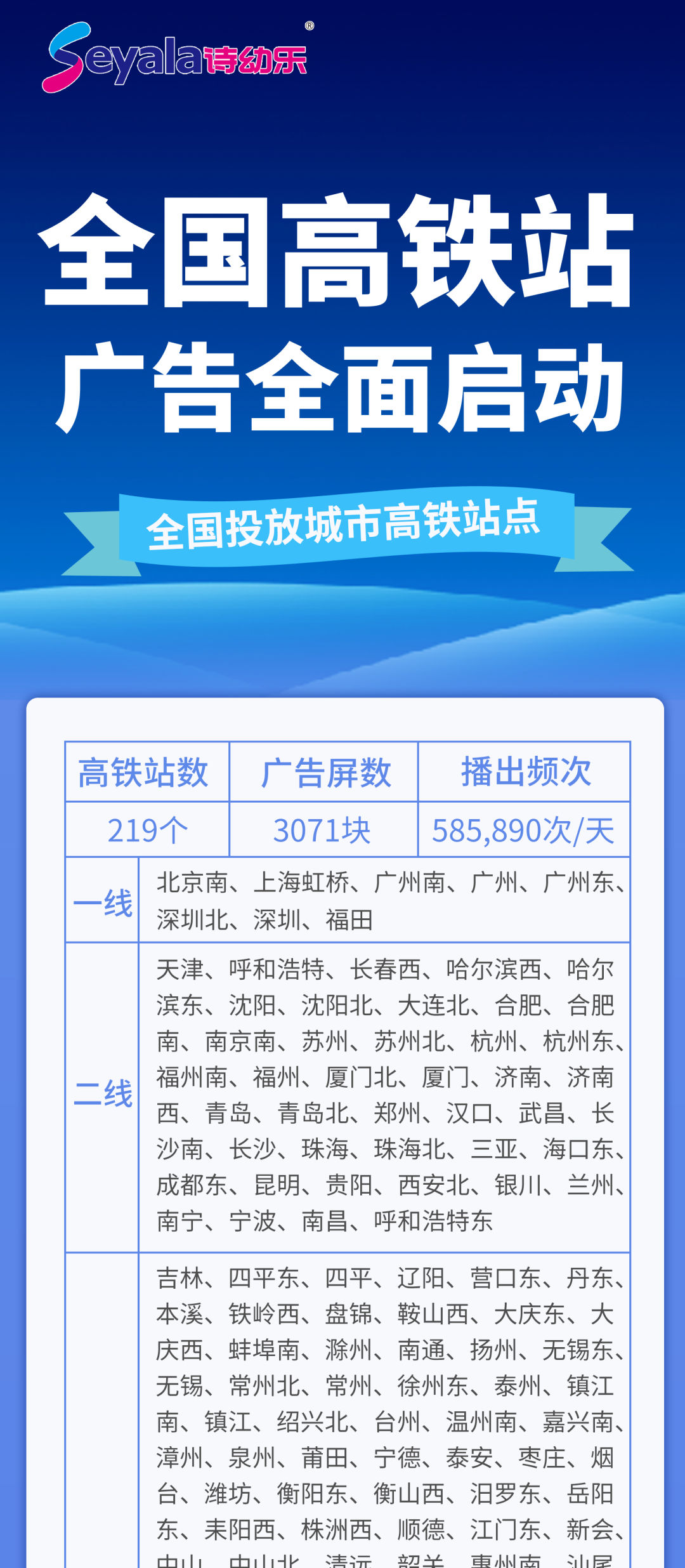 2019年1月28日至2月10日春運期間,詩幼樂宣傳廣告將覆蓋全國219個城市高鐵站點,播出頻次高達58萬次/天。全國高鐵站內隨處都能發現詩幼樂的身影,而詩幼樂也將在全國219個城市高鐵站點陪伴大家回家過年哦~