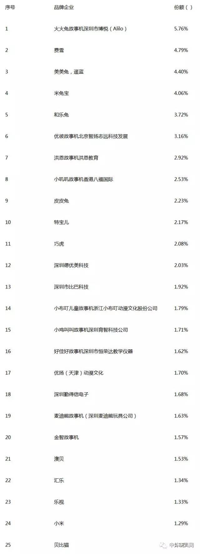 目前國內(nèi)市場格局:低端平均價位在150元價格以下空間占據(jù)68.3%以上市場份額,價位在150元-299元占據(jù)25.2%,299元以上占據(jù)6.5%。中高端價位市場相比往年形成反撲,份額提升較大,消費者接受度和需求理性化讓市場足部向中高端過度,低端市場份額下滑。 四、故事機行業(yè)競爭格局 兒童故事機產(chǎn)品已經(jīng)進入競爭加劇,群雄并起的時代,但行業(yè)產(chǎn)品同質化日趨嚴重,技術指導和品牌時代已經(jīng)到來,沒有個性就沒有競爭。經(jīng)過近5個度年頭的市場運作,我國故事機產(chǎn)業(yè)與兒童讀物市場現(xiàn)在已經(jīng)進入了白熱化狀態(tài),分級層次明顯。目前故事機品牌眾多,并且大部分銷量不好。大品牌,小品牌都擠在一起,形成故事機行業(yè)本身的競爭,這一格局急需改變。其中故事機市場品牌集中度較低,最大的為火兔兔,市場占有率為5.76%。 中國故事機品牌企業(yè)市場競爭格局情況