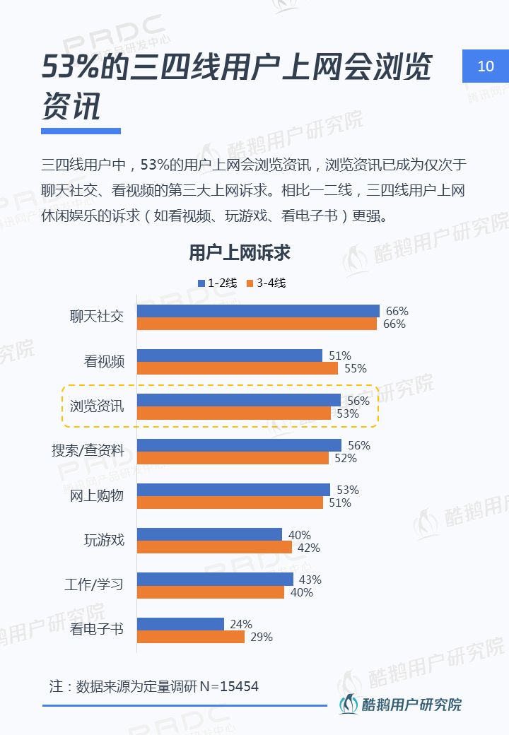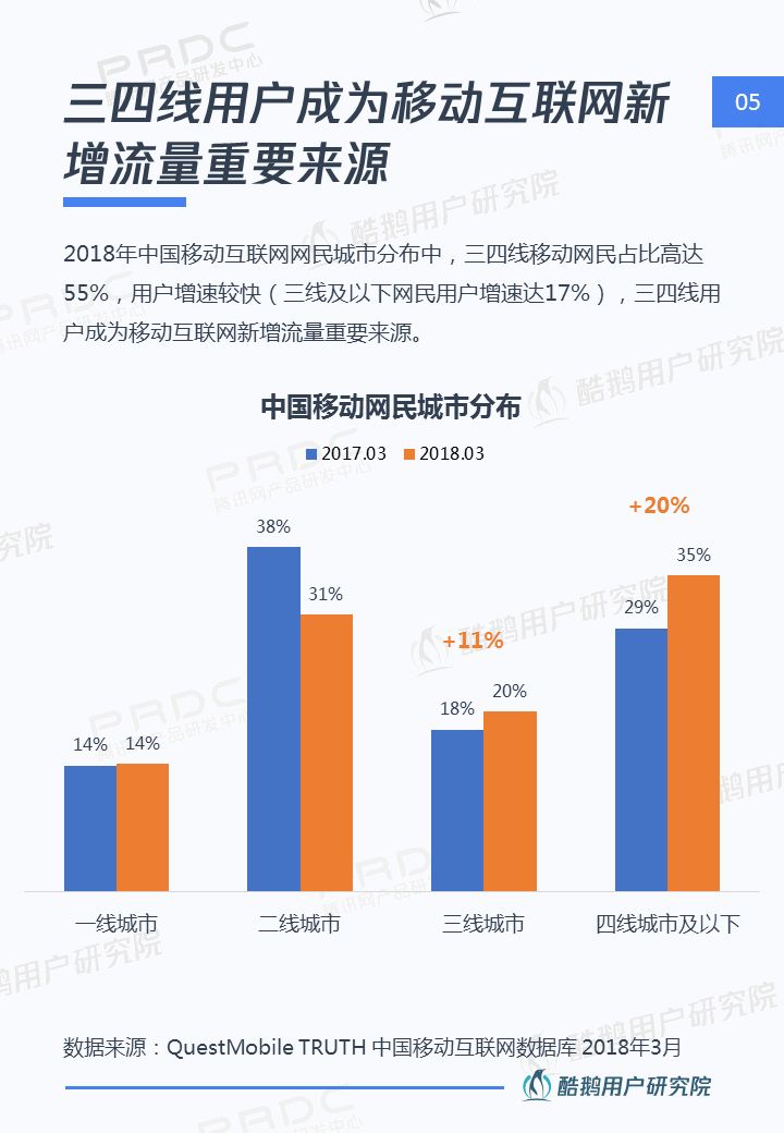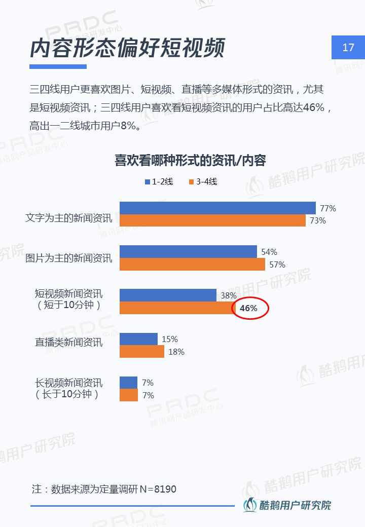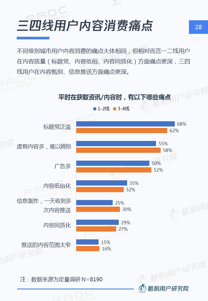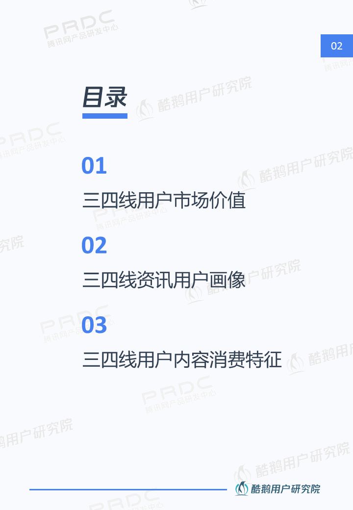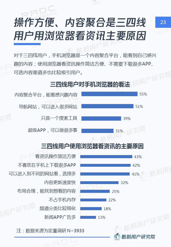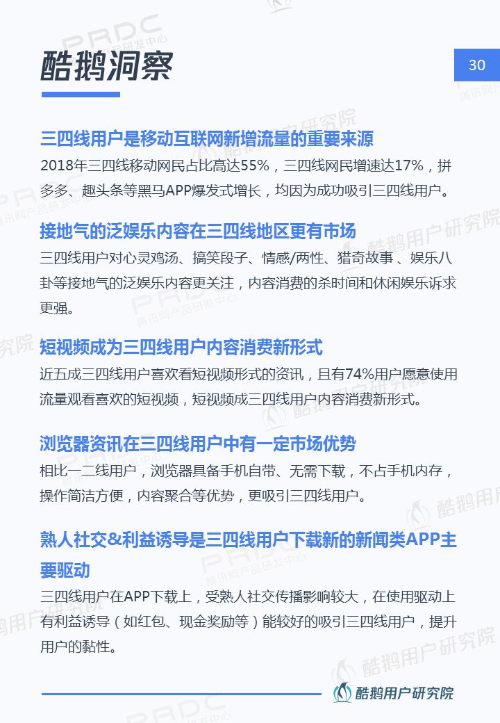 核心洞察 三四線用戶是移動互聯網新增流量重要來源 2018年三四線移動網民占比高達55%,三四線用戶增速達17%,拼多多、趣頭條等黑馬APP爆發式增長,均因為成功吸引三四線用戶。 接地氣的泛娛樂內容在三四線地區更有市場 三四線用戶對心靈雞湯、搞笑段子、情感/兩性、獵奇故事、娛樂八卦等接地氣的泛娛樂內容更關注,內容消費的殺時間和休閑娛樂訴求更強。 短視頻成為三四線用戶內容消費新形式 近五成三四線用戶喜歡看短視頻資訊,且有74%用戶愿意使用流量觀看喜歡的短視頻,短視頻成三四線用戶內容消費新形式。 瀏覽器資訊在三四線用戶有一定市場優勢 相比一二線用戶,瀏覽器具備手機自帶、無需下載,不占手機內存,操作簡潔方便,內容聚合等優勢,更吸引三四線用戶。 熟人社交&利益誘導是三四線用戶下載新的新聞類APP的主要驅動 三四線用戶在APP下載上,受熟人社交傳播影響較大,在使用驅動上有利益誘導(如紅包、現金獎勵等)能較好的吸引三四線用戶,提升用戶的黏性。