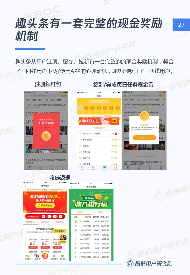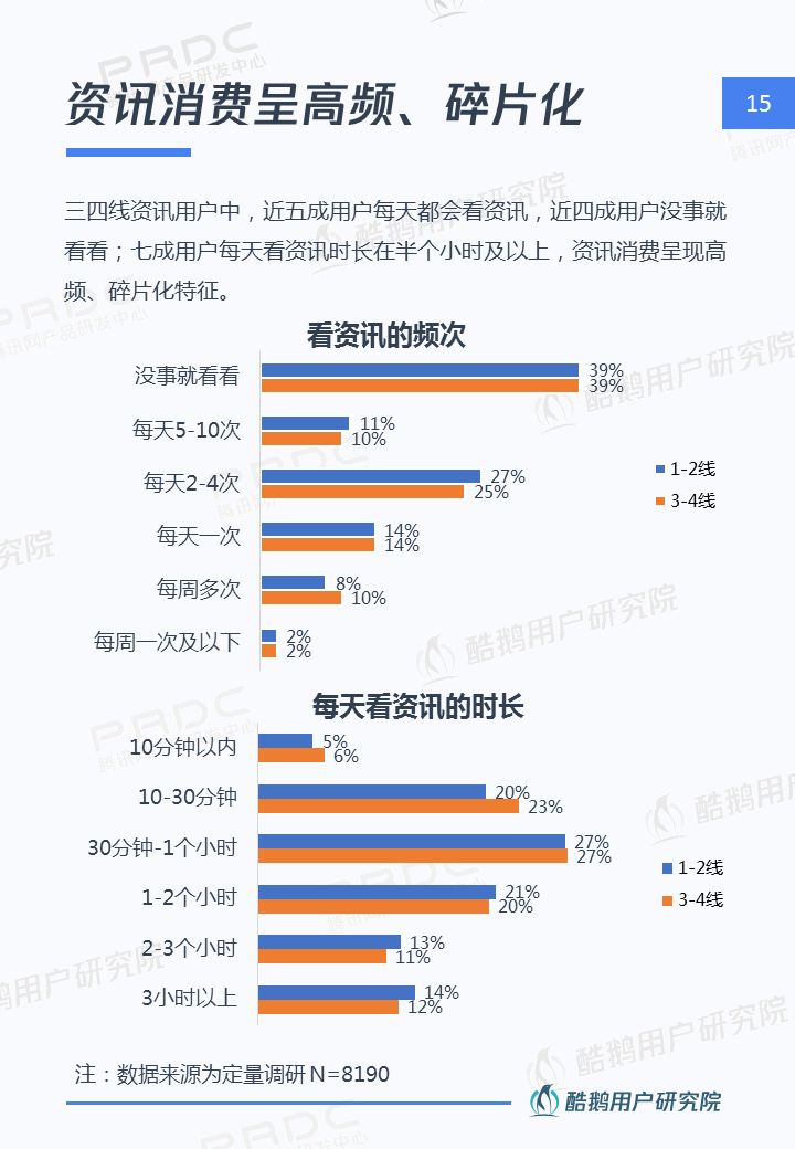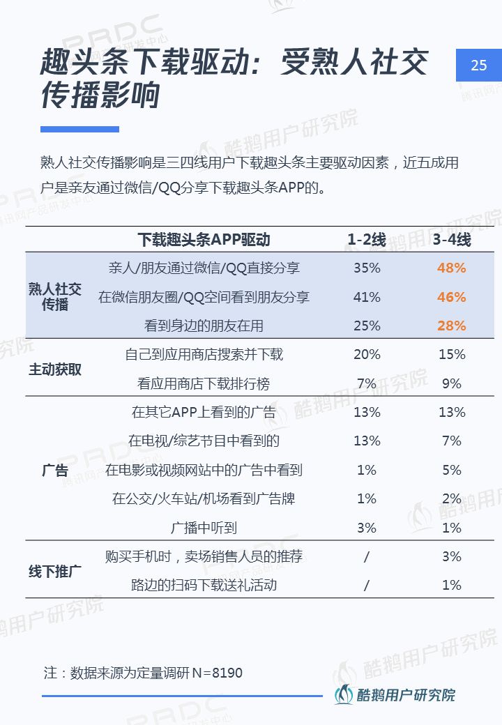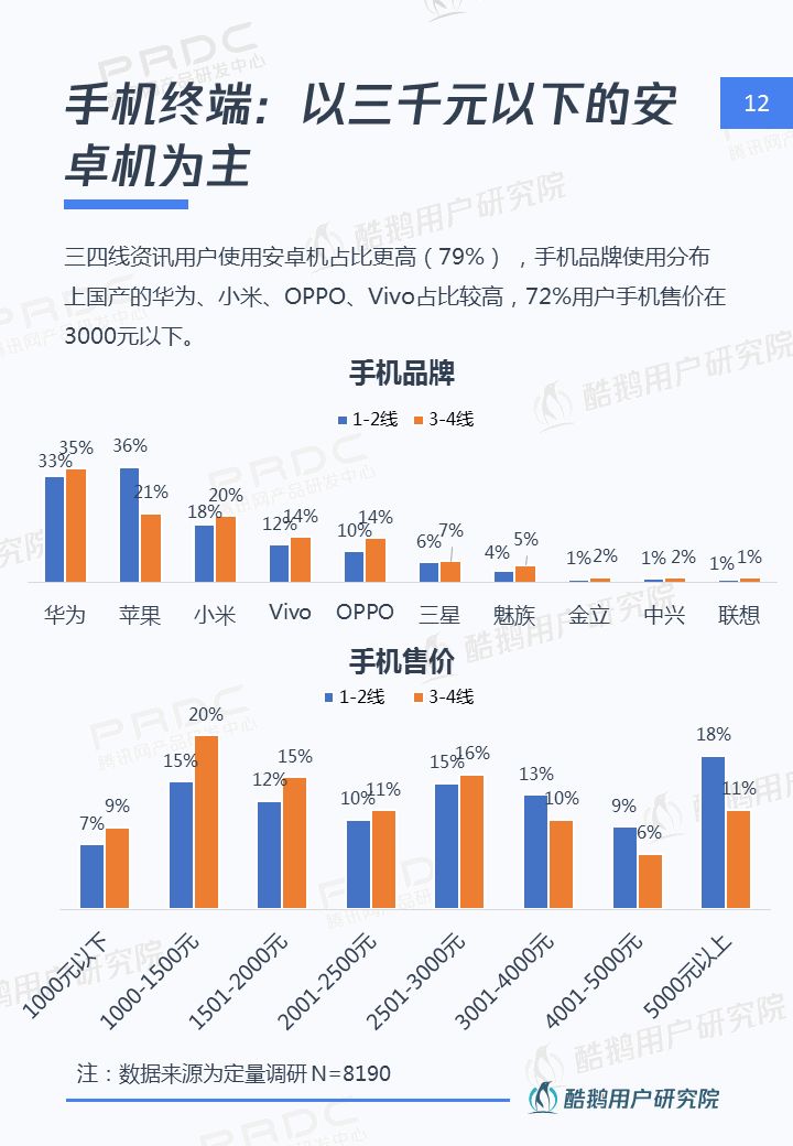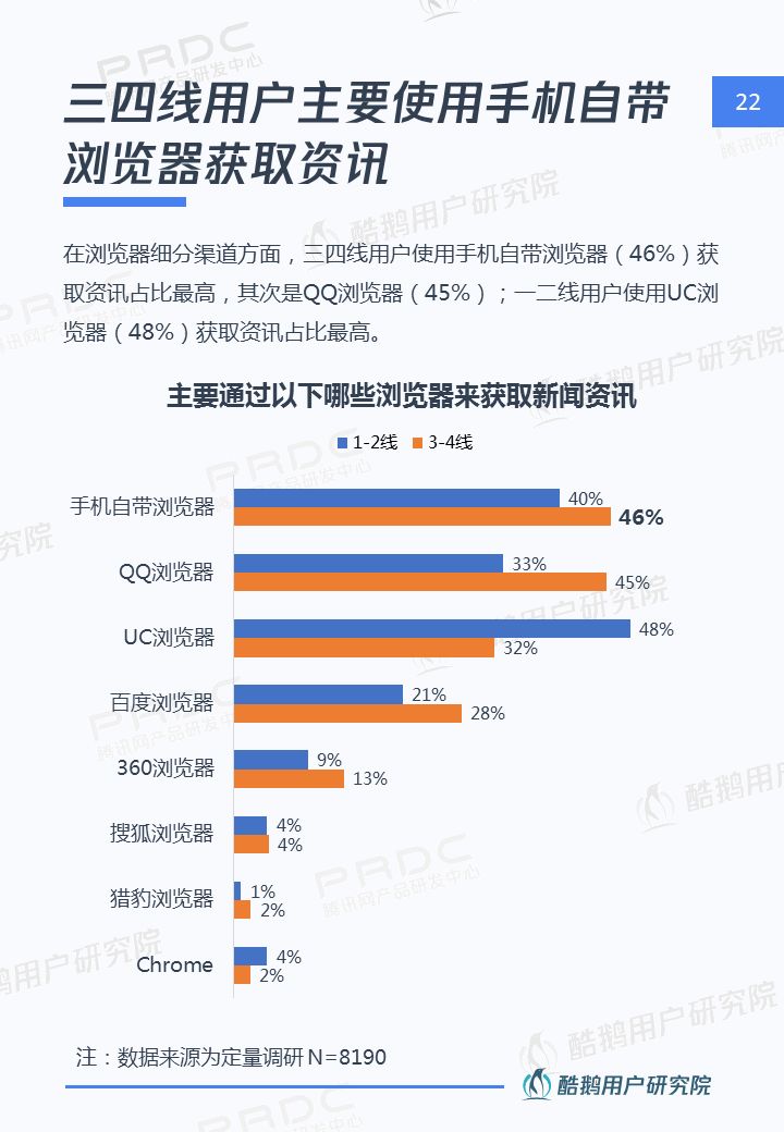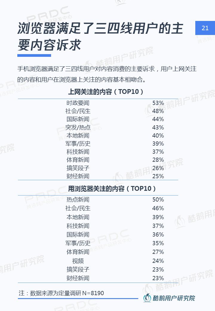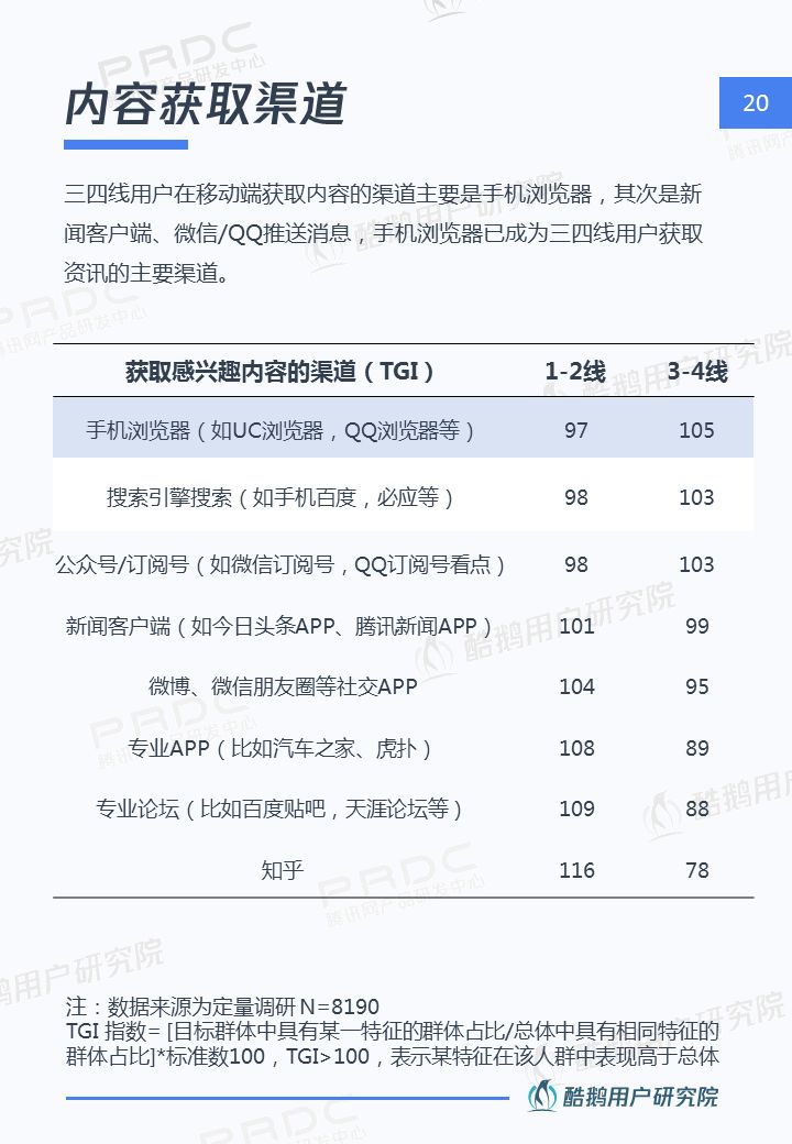 核心洞察 三四線用戶是移動互聯網新增流量重要來源 2018年三四線移動網民占比高達55%,三四線用戶增速達17%,拼多多、趣頭條等黑馬APP爆發式增長,均因為成功吸引三四線用戶。 接地氣的泛娛樂內容在三四線地區更有市場 三四線用戶對心靈雞湯、搞笑段子、情感/兩性、獵奇故事、娛樂八卦等接地氣的泛娛樂內容更關注,內容消費的殺時間和休閑娛樂訴求更強。 短視頻成為三四線用戶內容消費新形式 近五成三四線用戶喜歡看短視頻資訊,且有74%用戶愿意使用流量觀看喜歡的短視頻,短視頻成三四線用戶內容消費新形式。 瀏覽器資訊在三四線用戶有一定市場優勢 相比一二線用戶,瀏覽器具備手機自帶、無需下載,不占手機內存,操作簡潔方便,內容聚合等優勢,更吸引三四線用戶。 熟人社交&利益誘導是三四線用戶下載新的新聞類APP的主要驅動 三四線用戶在APP下載上,受熟人社交傳播影響較大,在使用驅動上有利益誘導(如紅包、現金獎勵等)能較好的吸引三四線用戶,提升用戶的黏性。
