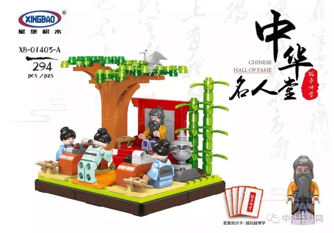 星堡積木中華街系列 此外,星堡積木還在積極探索新的中國風主題。據悉,本次展會將首發原創親子國學積木,第一季主題為“名人堂”,包括孔子講學、始皇出巡、蔡倫造紙、李白贈詩、張衡著書、林則徐硝煙六個型號。該系列意在對簡單的積木拼搭賦予親子交流、寓教于樂的互動價值,除積木顆粒和產品安裝手冊外,每一款都特別為孩子們增加了配套知識卡片,在輕松玩樂之間激發對歷史人物及中華文明、傳統文化的興趣。