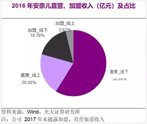 在線下銷售直營店結(jié)構(gòu)上,公司還加快了線下直營店鋪結(jié)構(gòu)調(diào)整,關(guān)閉經(jīng)營業(yè)績不達標(biāo)的百貨類店鋪,積極擴展購物中心店鋪。安奈兒正在積極加強各核心區(qū)域直營渠道的覆蓋密度,迎合購物中心商業(yè)業(yè)態(tài)的迅猛發(fā)展的趨勢,為公司創(chuàng)造更大的利潤空間,并一步強化品牌宣傳。 5、線上線下加盟,為品牌保駕護航 近些年,安奈兒也在不斷擴大加盟業(yè)務(wù)以及線上銷售業(yè)務(wù)。安奈兒主要采用直營與加盟相結(jié)合的銷售模式,加盟商模式有利于公司進行營銷網(wǎng)絡(luò)的快速擴張、節(jié)約資金投入、分擔(dān)投資風(fēng)險。安奈兒的加盟商大多分布于三四線城市,而直營店基本分布在三線以上。除了線下加盟,安奈兒的線上加盟模式也更有特色,除去品牌旗艦店以外,線上加盟的模式充分利用客服資源,包括物流資源,引流資源等。