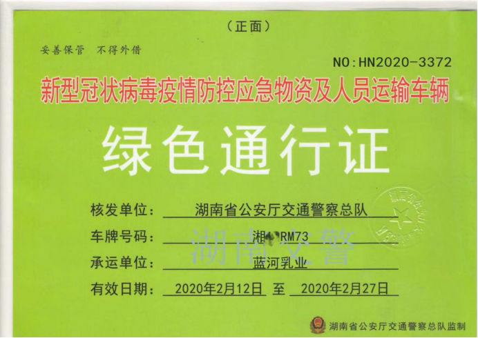 “無接觸配送服務”、“藍河寶寶口糧安全送到家”的多項服務,不僅竭盡所能地保障了疫情期間寶寶不斷糧,而且也為媽媽們增添一份安心。 值得關注的是,藍河作為湖南省招商引資重點企業和民生保供重點企業,政府給予了大力支持。湖南省商務廳下發“民生保供企業證明”、湖南省公安廳交通警察總隊頒發“綠色通行證”,全力保障寶寶新鮮、健康、安全的口糧輸送。