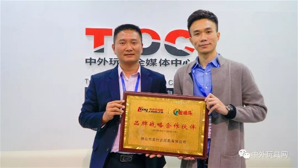 中外玩具網運營總監朱成相(左)向原子明頒發合作牌匾。 2018年,美仕達成為中外玩具網年度戰略合作伙伴,希望借助中外玩具網這一業界專業平臺進一步擴大品牌影響力。