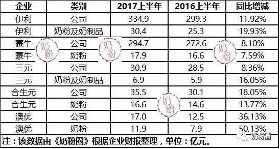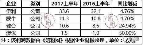 據(jù)上圖,以上企業(yè)都迎來(lái)了奶粉業(yè)績(jī)的增長(zhǎng),且超過(guò)行業(yè)增長(zhǎng)速度,加上飛鶴、圣元、君樂(lè)寶等上半年的銷(xiāo)量增幅,行業(yè)集中度明顯增加。我們也可以看到,伊利、澳優(yōu)、三元奶粉業(yè)務(wù)增長(zhǎng)都高于公司整體業(yè)績(jī)?cè)鲩L(zhǎng),成長(zhǎng)較快,權(quán)重增加;而蒙牛、合生元奶粉業(yè)務(wù)增長(zhǎng)都低于公司整體業(yè)績(jī)?cè)鲩L(zhǎng)。合生元的財(cái)報(bào)顯示其嬰幼兒奶粉增長(zhǎng)13.77%至16.61億元,其中高端及超高端奶粉增長(zhǎng)了18.3%。三元財(cái)報(bào)重點(diǎn)提及了公司聚焦主力產(chǎn)品和高端產(chǎn)品,提高中高端產(chǎn)品占比,培養(yǎng)高端明星產(chǎn)品,如三元極致 A2β -酪蛋白,三元藍(lán)標(biāo)愛(ài)力優(yōu)奶粉等;伊利財(cái)報(bào)提及公司聚焦戰(zhàn)略,實(shí)施精準(zhǔn)營(yíng)銷(xiāo),“金典”、“金領(lǐng)冠”等重點(diǎn)產(chǎn)品系列的銷(xiāo)售收入比上年同期增長(zhǎng)近 31%. 2、2017年上半年利潤(rùn)及對(duì)比