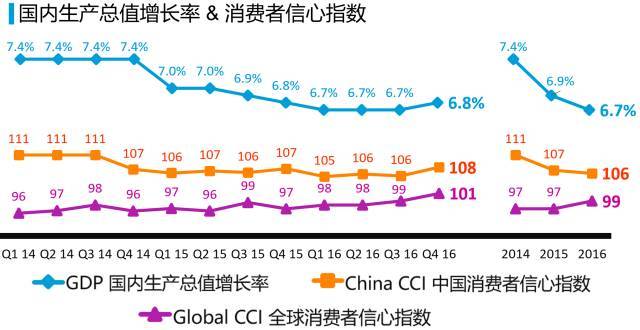 整體市場及品類和母嬰用品店 渠道現狀及趨勢 尼爾森研究發現,2016年消費者信心指數在經歷了三個季度的平穩后,于第四季度明顯增長,從105%上升至108%。就業預期的提升為拉動四季度信心指數提升的主因,而消費意愿的加速增長更是促進了全年的消費者信心指數企穩回升。