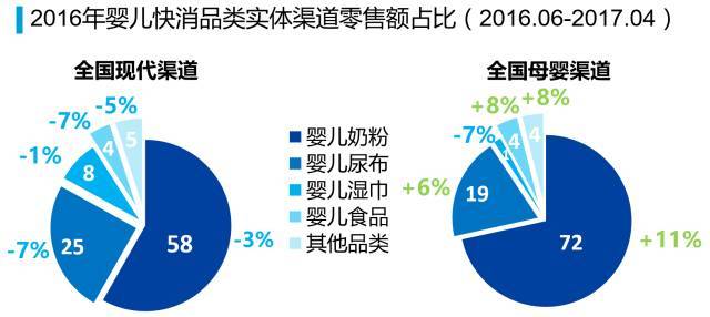 母嬰實體店的2016年銷售額比2015年同期有明顯的上升,母嬰用品的主要品類對比同期除嬰兒濕巾外都有增長。探究其增長來源,除了銷量的直接增長和消費升級的增長外,新產品可以帶動銷量的增長,在嬰兒谷物方面這一現象尤為明顯。這一現狀的背后也展現出在母嬰市場,創新的重要性需要落實到銷量的增長,才能真正體現作用。進而,尼爾森通過研究母嬰用品銷售現狀,進一步分析其渠道的變化。
