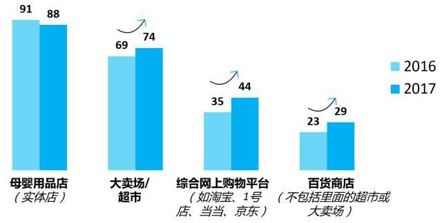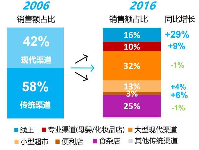 尼爾森指出,渠道多樣化使得整體的市場格局日益復雜。在理性消費的前提下,消費者在各渠道各取所需,完成日常購物。2006年主要集中在現代及傳統兩大渠道,經過10年的發展,線上、專業渠道(母嬰/化妝品店)、大型現代渠道、小型超市等渠道相繼出現,供消費者的選擇渠道越來越多,其競爭也愈發激烈。