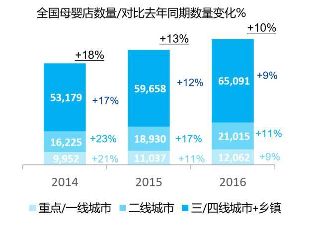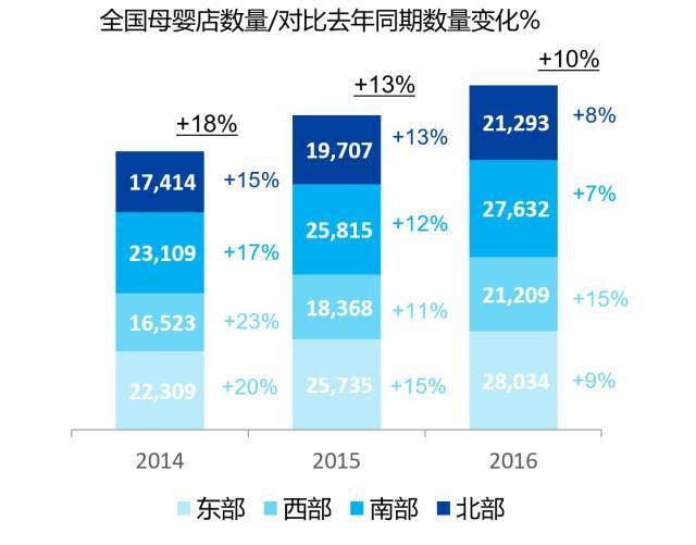 過去兩年,母嬰用品實體店的數量仍在增加,但是增速放慢,分不同的城市級別來看,二線城市在2016年增幅較其他城市略快,低級別城市與重點/一線城市增幅相同。分不同的區域來看,在2016年除西部地區增長速度有所上升,其他三個地區的母嬰用品實體店的數量增長速度明顯放緩,尤其是東部和南部地區。