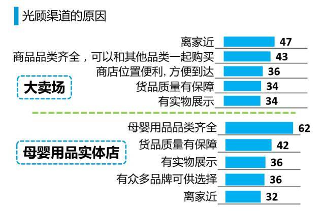 分不同年齡層來看,0—12個月之前基本依賴是母嬰渠道。隨著照顧寶寶的經驗增長,7-12個月小孩的父母嘗試更多的渠道。同時,在這個階段,媽媽對母嬰用品實體店的依賴程度更高。相較于其他階段,1-3歲嬰兒的父母更偏愛在百貨商店購買母嬰產品。 不同的渠道對于消費者來說有不同的優勢: - 大賣場吸引消費者的主要優勢在于離家近(47%) 、品類齊全(43%)、位置方便(36%); - 而母嬰用品實體店則是以母嬰用品品類齊全(62%)、貨品有保障(42%)、有實物展示(36%)成為吸引消費者的光顧的重要因素。 尼爾森也發現,“店員能夠根據需求推薦合適的商品”和“只有這類型的商店才有我要買的產品”這兩個指標和去年相比增幅較大,分別達到21%和16%,相比去年起重要性排名分別上升了5名和3名,也就是說,消費者一方面對商家、產品的推廣方法提出更高要求,另一方面也對商品的獨特性有一定期待。同時,對于母嬰店而言,分別有四成購物者更期待門店內嬰兒游泳池以及提供媽媽臨時喂奶的專門區域。