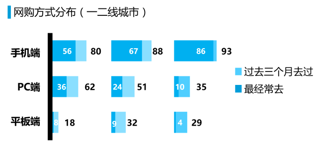 2. 在網購方式上,手機端依舊是父母們購買母嬰產品最常使用的網上方式 網店對于母嬰用品實體店來說,在節省時間、送貨上門和價格的靈活性方面具有著獨特的吸引力。55%的受訪消費者表示,光顧網購的主要原因是“24小時隨時可以下訂單”,“節省時間”(54%)和“送貨上門”(46%)也是驅動母嬰消費者網購的因素。在一二線城市中,手機端的滲透率持續上升,而PC端和平板端的比例下降明顯。