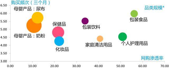 那么在母嬰店購買的消費者到底是一群什么樣的人呢?尼爾森研究發現,中國母嬰店客群身上所具有的標簽有以下幾點:30歲左右、平均家庭月收入1萬以上、高學歷的在職女性。 母嬰用品網購發展態勢 1.母嬰產品是購買頻次最高的品類,但是其網購滲透率偏低,因此未來還有非常大的發展空間 據尼爾森研究所示,目前,網上購物平臺已為58%的媽媽所使用,且滲透率呈逐年上升趨勢,但網購至今仍未能代替母嬰店成為顧客最常光顧的渠道。
