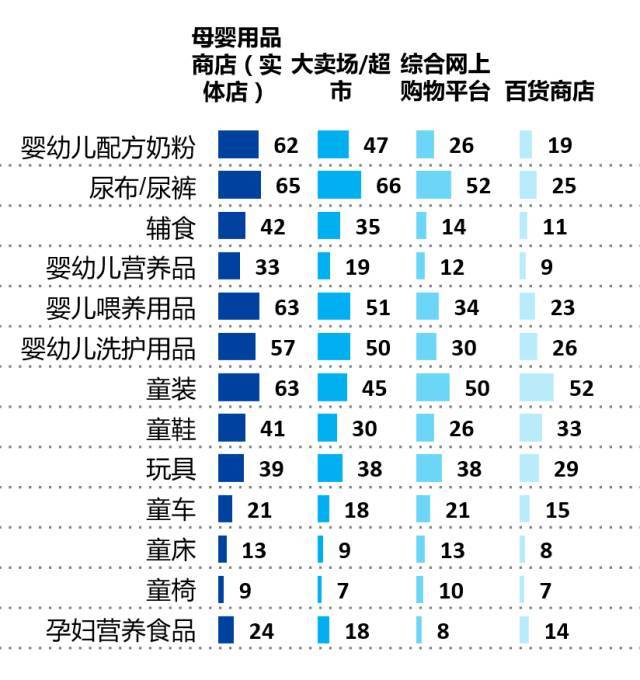 從購買母嬰產品的三大渠道——母嬰店、賣場超市以及網上購物平臺的消費者購買品類來看: - 母嬰實體店是滿足一站式的母嬰用品需求,品類需求全; - 大賣場/超市以尿布/尿褲(66%)和洗護(50%)為主; - 網購的品類集中在尿布/尿褲(52%),童裝(50%)和玩具(38%) 其他渠道例如百貨商場的品類以童裝童鞋以及玩具為主。藥店主要是嬰幼兒和孕婦的營養品。海外購入和海淘以奶粉和尿布/尿褲為主。