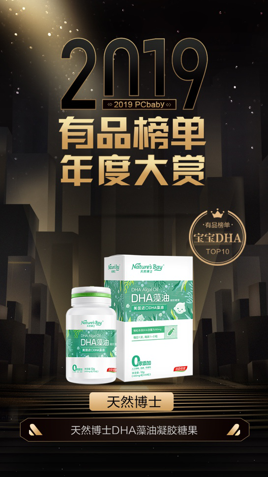 湯臣倍健天然博士DHA藻油榮獲2019PCbaby有品榜單·年度甄選寶寶DHA。 湯臣倍健天然博士DHA藻油美國進口藻油,琥珀金色質感,不添加人工香精,每粒(400mg)含DHA 100mg,海藻中提取,口感清新。