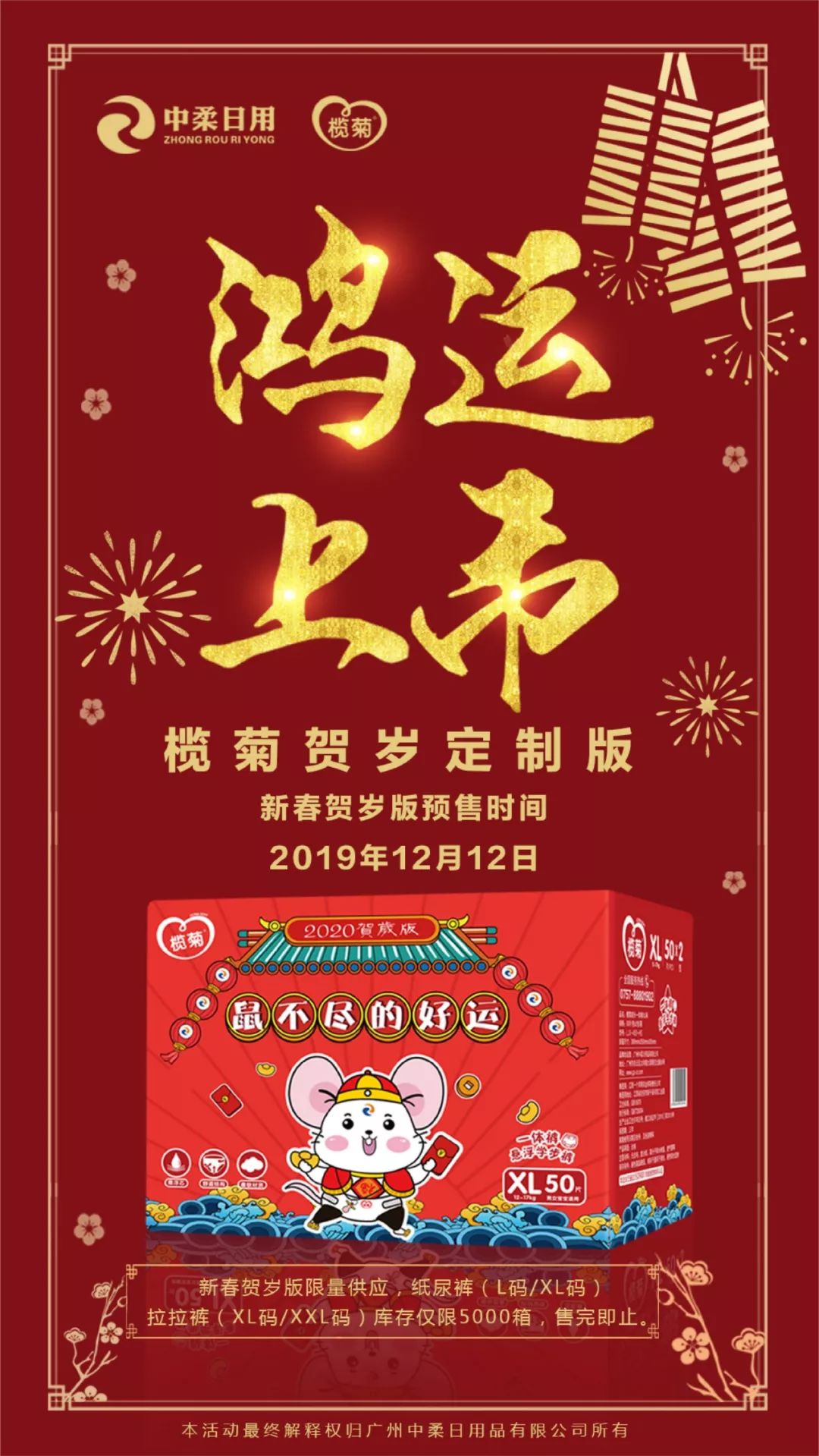 在中國傳統文化里,鼠乃是靈性、生命力的象征,是聰慧,敏銳,活力滿滿的體現。鼠年即將到來,欖菊安耐不住了,帶著財神小鼠、率先亮相,送上新年幸運。 欖菊以愛之名,誠意巨作,經過2個多月的精心準備,獻上充滿年味的賀歲版紙尿褲,欖菊賀歲定制版橫空出世!