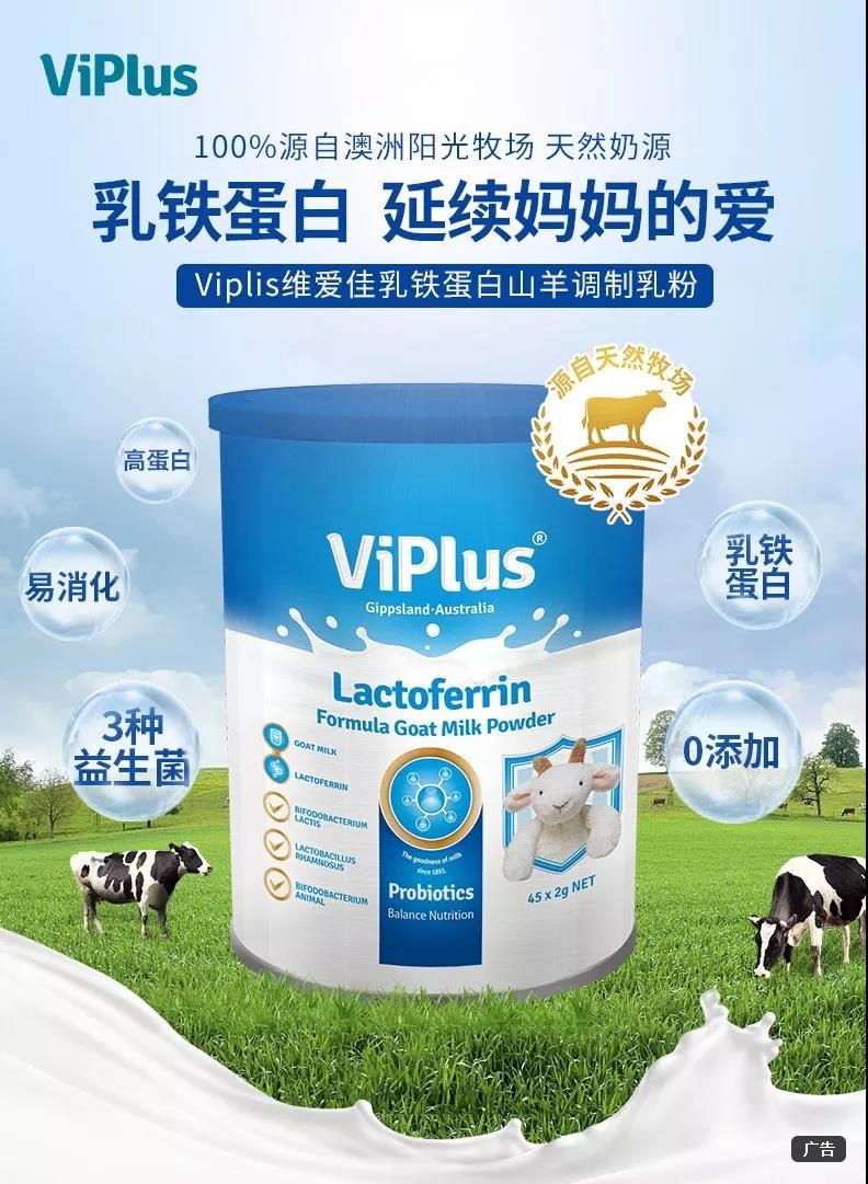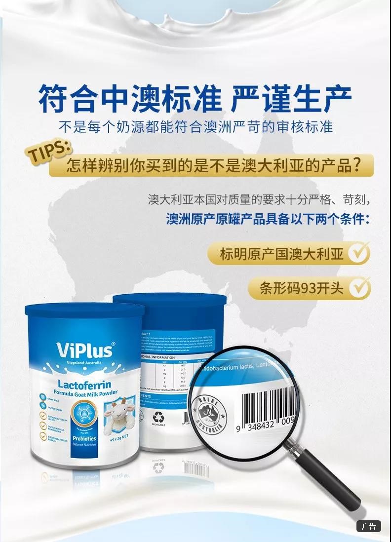 ViPlus乳鐵蛋白山羊調制乳粉,源自澳洲吉普斯蘭陽光牧場,原裝原罐進口,天然無添加;高蛋白、易消化、含有雷特氏B菌、鼠李糖乳桿菌、動物雙歧桿菌三種益生菌,菌落群落總數是10億 CFU/包(2g),即450億 CFU/罐(90g);全程采用低溫冷提取技術,嚴格遵守中澳標準,產品安全放心。