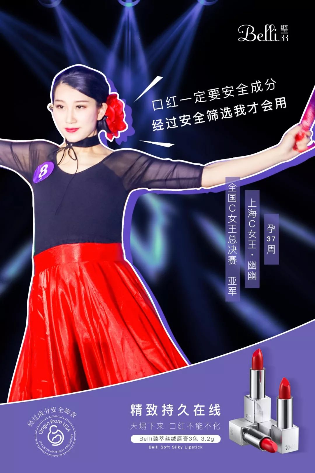孕期邋遢?不存在的。幽幽不光孕期照常化妝做睫毛,還照常上班工作出差。幽幽的工作是舞臺編導,除了排演節目,自己經常也要上臺表演。什么劈腿下腰都不在話下。在孕周超過主辦方活動要求時,幽幽仍堅持參加,在強敵如林的上海賽區捧回冠軍桂冠。幽幽還放話說,如果表演現場發動了,就直接去隔壁醫院生娃。 不要說大家被幽幽的故事震驚,見多識廣的璧寶也是想象力劃破天際。C女王的風采真不是一般人能Hold的住~ 別看幽幽女王這么虎,對孕期彩妝的要求嚴格,只有經過嚴格篩選,成分安全的產品才能入得了她的眼。 -安全口紅續命-