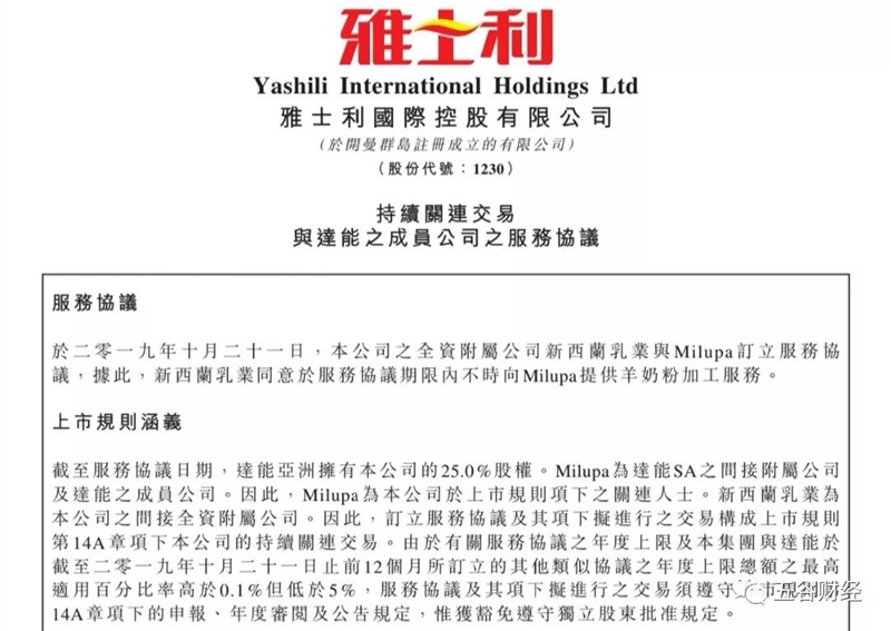 近年來,羊奶粉行業逐漸崛起,雖然仍屬小眾市場,但是,天風證券卻在研報中認為,未來通過進一步消費者培育,羊奶粉占有率預計初步可提升至 10%,未來更是有望成為與牛奶粉平分秋色的主流市場。 數據顯示,2019年,澳優旗下佳貝艾特、宜品乳業旗下蓓康僖、和氏乳業旗下澳貝佳、維愛佳羊奶粉、美可高特羊奶粉的銷售勢頭都明顯超出預期,個別品牌銷售同比增幅在100%以上。 作為羊奶粉行業的“后來者”,雅士利國際(01230.HK)于2018年推出了“朵拉小羊”羊奶粉,僅用八個月時間銷售就突破了億元大關,這超出了管理團隊的預期,也讓雅士利國際“嘗到了甜頭”。 基于此,日前,雅士利國際發布持續關聯交易公告表示,其全資附屬公司新西蘭乳業與Milupa訂立服務協議,同意于服務協議期限內不時向Milupa提供羊奶粉加工服務。