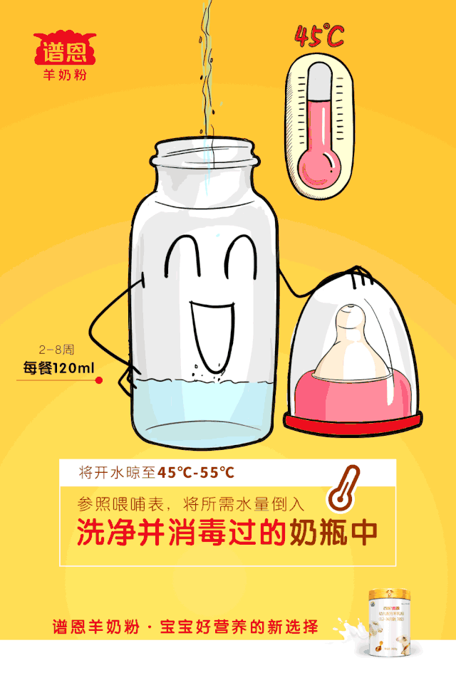 2、將開水晾至45℃-55℃,參照喂哺表,將所需水量倒入洗凈并消毒過(guò)的奶瓶中