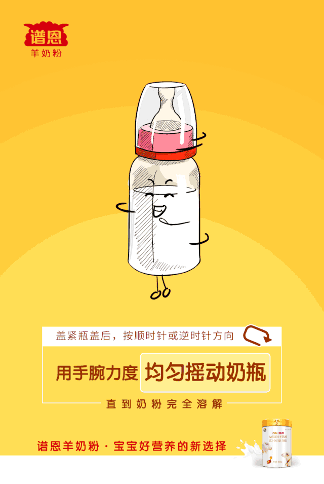 4、蓋緊瓶蓋后,按順時(shí)針或逆時(shí)針?lè)较蛴檬滞罅Χ染鶆驌u動(dòng)奶瓶直到奶粉完全溶解