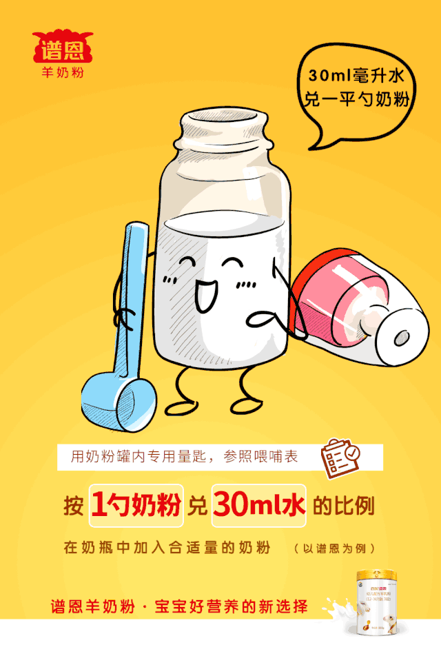 3、用奶粉罐內(nèi)專用量匙,參照喂哺表按1勺奶粉兌30ml水的比例在奶瓶中加入合適量的奶粉