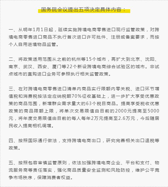 近年來,消費者對嬰幼兒配方奶粉日益關注,而進口產品更是受到消費者“青睞”,根據中國奶業協會官網數據,2017年我國進口嬰幼兒配方奶粉為29.6萬噸,同比增長33.37%。在奶粉線上銷售部分,外資奶粉優勢依舊非常明顯。另外在跨境電商領域中,嬰幼兒配方乳粉進口增長勢頭非常迅猛。在跨境電商產品中,母嬰類排名第一,而嬰幼兒配方乳粉又是其中炙手可熱的暢銷品,嬰幼兒奶粉跨境購已發展成為進口奶粉消費的重要渠道。受2018奶粉配方注冊制和2019《電商法》的限制,不少外資品牌和跨境電商一直提心吊膽,但昨天的國務院會議提出五項新規定,跨境電商零售進口繼續現行政策,如今跨境購政策不斷松綁原因何在,這對十分依賴這一渠道進口的奶粉行業又將有怎樣的影響? 國務院規定從明年1月1日起,延續實施跨境電商零售進口現行監管政策,對跨境電商零售進口商品不執行首次進口許可批件、注冊或備案要求,而按個人自用進境物品監管。其實針對跨境電商零售進口商品,政策曾多次進行調整。2016年4月8日,我國對跨境電子商務零售進口商品實施新稅制,并實行清單管理(48新政)。核心為調整關稅、正面清單、通關單三項內容:即在稅收層面,實施跨境電子商務零售進口稅收政策;在通關層面,參照進口商品正面清單,需按貨物驗核通關單,并對化妝品、嬰幼兒配方奶粉等商品提出了首次進口許可批件等要求。但之后,新政不斷延期過渡。 不可否認,“48新政”的出發點是好的,比如,嬰兒食品、藥品等要符合中國的標準,保護好消費者的權益,但在執行層面,參照一般貨物貿易管理,在通關單等問題上,獲取進口資格的備案、通關單和質檢證明,這都需要很長的周期,而嬰兒奶粉、食品、藥品等商品時效性很強,在執行力度上會遇到較大問題,為了適應跨境電商的行業特征,因此新政一再延期過渡。 關于這一系列政策過渡期延長,商務部電子商務和信息化司司長騫芳莉就表示過:“我們將堅持鼓勵創新包容審慎的原則,按照‘暫按個人物品監管’的總體思路,優化完善監管措施,同時保證監管安排的總體穩定。”因為若將跨境進口商品按照“貨物”定性,就會使得美妝、保健品等商品無法正常進區,而若定性為“個人物品”,其將不再受制于一般貿易的監管。 也就是說嬰兒奶粉跨境將不受國內配方注冊制限制,資料顯示,截止目前,獲得配方注冊的奶粉品牌多是國產品牌,而跨境電商不在奶粉新政的范圍之內,也就是很多外資品牌雖然不能拿下配方注冊,但仍然可以通過跨境電商渠道進入中國市場。 同時規定在進一步擴大享受優惠政策的商品范圍,新增群眾需求量大的63個稅目商品。提高享受稅收優惠政策的商品限額上限,將單次交易限值由目前的2000元提高至5000元,年度交易限值由每人每年2萬元提高至2.6萬元,今后隨居民收入提高相機調增。 數據顯示,以多元化、品質化為優勢的進口商品類消費持續擴大。商務大數據顯示,1-9月份,化妝品、糧油食品和服裝進口消費品網絡零售額排名前三,分別占跨境進口網絡零售額的33.6%、22.2%和13.8%。居民年交易額的提升,不僅僅滿足了國民對消費升級的需要也意味著對于跨境奶粉電商而言,奶粉的需求量可能增加,銷售額將進一步擴大。 再者,2017年國務院發布的《國務院關稅稅則委員會關于調整部分消費品進口關稅的通知》終就表示,自2017年12月1日起,以暫定稅率方式降低部分消費品進口關稅,范圍涵蓋食品、保健品、藥品、日化用品、衣著鞋帽、家用設備、文化娛樂、日雜百貨等各類消費品,共涉及187個8位稅號。其中就包含特配粉,特配粉的關稅減免為零對中國特配粉行業發展很不利,目前我國的特配粉還在起步階段,還需要國內企業加大投入研發,而國外特配粉關稅減免后競爭優勢將更加明顯,這對國內特配粉的研發創新都是一種打擊。 但近年來隨著跨境電商的迅速發展,也給消費者帶來了眾多問題,如:假貨泛濫、信息泄露、刷好評銷量、虛假宣傳等等,甚至還衍生出造假產業鏈,代購視頻、小票、快遞運單、購物發票等都能以假亂真。雖然政策放寬,但監管制度會加強,即將實施的《電商法》對跨境電商提出了約束,對經營規模較大、頻率較高的職業代購做出了嚴格規范,對嬰幼兒食物、保健品、化妝品等進口商品的質量監控更加嚴苛,保證了消費者的權益。