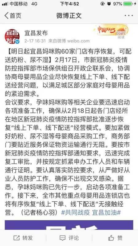 向商務局直接申請“特許的經營服務”,也是因地而異的,就目前了解到的情況,湖北其他地方還沒有類似的案例,至于原因呢,一說是因為當地政府“多一事不如少一事”的觀念作祟,“一刀切”,如陜西某地的一家企業就深受其苦,復工申請一改再改,仍未通過。 政府所顧及的往往是大局,相比與口糧、是否斷貨或者正常的開工問題,顯然,當下最重要的還是疫情的防控。 由此來看,突破危局還得靠自救,門店連鎖在這個時期不能坐以待斃,而要主動表明自己的訴求然后想法設法去合理爭取。孕味媽咪購與當地政府的協作提供了一種表率、一種示范,在疫情面前,災難也是“公平”的,但應對災難,誰能更好地做好本職——保障自己的消費者“不斷糧”就得看自己的造化了。 筆者始終信奉兩句話:一句是,辦法總比困難多;而另一句則是,天助自助者。 |