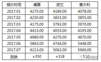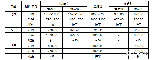 歐洲方面,奶粉類產品開始走穩,而乳脂在進入7月下旬后,進入瘋狂上漲模式。 4、南美市場報價情況(美元/噸, CIF主要中港口)
