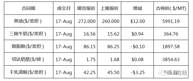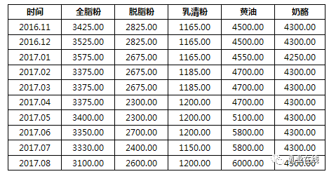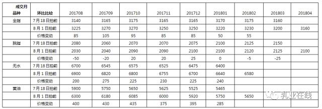 和上次拍賣及去年同期拍賣對比: 一、GDT拍賣數量變化 1、總量方面,本次6個中國常參與品種合計33560噸,環比上次增加6467噸,增加比例23.87%;同去年比減少投放1280噸,減少比例為3.67%; 供應數量仍然同比減少環比增加,但同比的降幅在逐漸縮小。 2、環比7月18日拍賣投放數量各品種全面增減,無水黃油增加685噸,比例24.42%;無鹽黃油增加790噸,比例38.16%;切達奶酪增加240噸,比例21.43%;酪蛋白增加75噸,比例15.79%;中溫脫脂粉增加2062噸,比例34.44%;普通全脂粉增加2615噸,比例17.87%。 3、同比去年8月2日拍賣投放量:無水油減少785噸,減少比例18.36%;黃油減少775噸,減少比例21.32%;切達奶酪減少70噸,減少比例為4.9%;酪蛋白增加150噸,增加比例37.5%;脫脂粉減少50噸,減少比例0.62%;全脂粉增加250噸,增加比例1.47%;相比7月份的2次拍賣同比的大幅度減少,本次投放量依然少于2016年同期,但差距在迅速縮小。 4、同比7月18日的對本次拍賣預告的投放量,2個乳脂產品繼續較預告增加:無水油實際投放增加380噸,比例12.22%,;黃油增835噸,比例為41.23%;基于目前乳脂產品的瘋狂走勢,生產者樂于投放遠超預期的數量。 二、新西蘭、芝加哥期貨交易所期貨、歐洲現貨、南美現貨市場報價(美元/噸) 1、新西蘭期貨交易所最新價格
