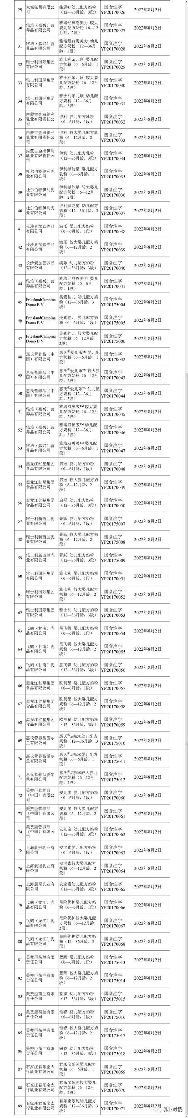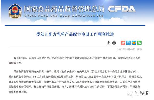誰是最大贏家? 進入下半年以來,乳企和經銷商都在苦苦等待注冊制新政落地。 8月3日晚間,國家食藥監總局在官網上悄然掛出《嬰幼兒配方乳粉產品配方注冊工作順利推進 》一文,稱截至8月3日,國家食藥監管總局已批準22家企業的89個嬰幼兒配方乳粉產品配方的注冊申請,后續獲準注冊信息將即批即公布。 根據食藥監局公布的名單,在這89個配方系列中,國內市場上的主要乳企,如伊利、蒙牛(雅士利)、貝因美、飛鶴、君樂寶、健合集團等,外資品牌惠氏、菲仕蘭、雅培、美贊臣等成為首批通過的企業,其中外資企業5家,國內企業17家。 記者注意到,擁有工廠較多的企業成為此次首批名單的大贏家。其中貝因美拿下12個配方,雅士利則拿下21個配方,飛鶴和外資品牌美贊臣各拿下9個配方。而此次獲批的也大多是乳企目前熱銷的主力系列,如貝因美的愛加、臻愛;惠氏的啟賦、愛兒樂;飛鶴的星飛帆、健合集團的素加等。 資深乳業分析師宋亮告訴記者,首批通過的企業絕大部分都是國內市場的主流乳企,一方面大企業的技術儲備和研發的能力很強,準備也較為充分;另一方面,政府或也希望通過大企業來做表率支持配方注冊。