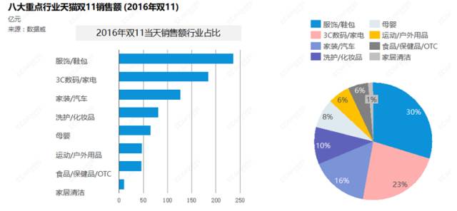 上一期我們分享了服飾鞋包行業(yè)的雙十一備戰(zhàn)策略,本期我們將集中分析母嬰行業(yè),探索在琳瑯滿目的商品中,母嬰品牌商如何制定方案,決勝千里之外。 行業(yè)縱觀:2016年阿里成交額達(dá)1207億元,母嬰行業(yè)占比8% 2016年雙十一阿里成交額達(dá)1207億元,同比上漲32%,雖然電商市場的規(guī)模增長還未觸碰天花板,但電商紅利消褪,整體增速放緩。母嬰用品雙十一當(dāng)天銷售額達(dá)到96億元,在八大重點(diǎn)行業(yè)中排名第五,約占8%,占比上升。對比八大行業(yè)在2014-2017四年銷售額上半年占比和增長率發(fā)現(xiàn),母嬰用品占比基本維持在6%-7%,四年復(fù)合增長率為45%。隨著二胎政策的全面實(shí)施和年輕父母群體的消費(fèi)升級,母嬰行業(yè)的市場將得到擴(kuò)張,TopDigtal預(yù)測,在2017雙十一期間,母嬰用品的銷售額會得到提高,占比繼續(xù)加大。 八大重點(diǎn)行業(yè)天貓雙十一銷售額(2016年)
