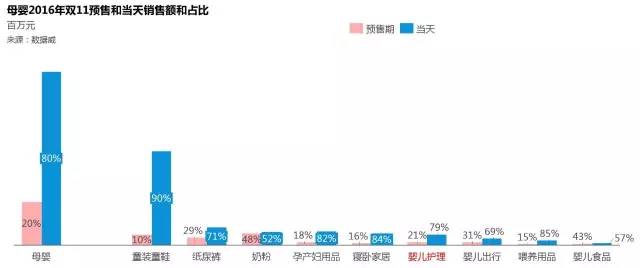 (數(shù)據(jù)來源:ECdataway數(shù)據(jù)威) 預(yù)售期間,母嬰用品各子類間銷售額差別較大,其中奶粉/嬰兒食品等類目預(yù)售銷售額占比較高 母嬰行業(yè)雙十一預(yù)售和當(dāng)天銷售額對比(2016年)