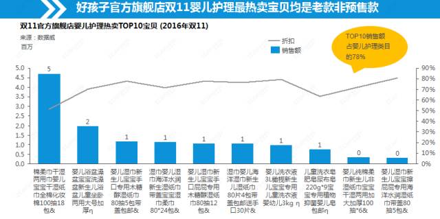 (數(shù)據(jù)來源:ECdataway數(shù)據(jù)威) 另外,在不同價格段中,全棉時代官方旗艦店濕巾高價位段銷售額占比上升,162到195元、227元以上濕巾分別貢獻(xiàn)了31%和30%銷售額,均較平時上漲約8%。而0到65元、65到97元濕巾銷售額都有減少。為什么會形成這樣的銷售變化呢?全棉時代將不同價格段間的產(chǎn)品組合在一起,形成全新產(chǎn)品套餐,比如把0到65 元和65到97元間的產(chǎn)品合并打包,推出130元組合產(chǎn)品系列,熱賣品帶動非熱賣品,完成產(chǎn)品售賣,因此使得高價格段銷售額增加。 熱賣商品多為老款非預(yù)售,前十寶貝占到類目銷售額的94% 對比好孩子、全棉時代、保寧等官方旗艦店數(shù)據(jù),在嬰兒護(hù)理類目中,熱賣寶貝top10中多為老款非預(yù)售產(chǎn)品,前十名熱賣寶貝銷售額要占到銷售額的75%以上,有的甚至達(dá)到91%。由于母嬰產(chǎn)品適用人群主要是0-12歲的嬰童,產(chǎn)品安全性是用戶最為看重的因素,因此80、90年輕媽媽們在挑選母嬰用品時是非常謹(jǐn)慎的。當(dāng)用戶對某品牌或產(chǎn)品形成了信賴和忠誠度,要接受新款產(chǎn)品是比較難的,這也是好孩子熱賣產(chǎn)品多為老款的原因。
