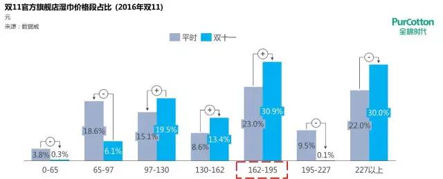 (數(shù)據(jù)來源:ECdataway數(shù)據(jù)威) 從以上三張圖可以看出,三家品牌占據(jù)銷售額首位的類目均不相同,這是由品牌自身特質(zhì)決定的,全棉時代主打以優(yōu)質(zhì)棉呵護(hù)嬰兒肌膚,保寧在清潔方面建樹不凡,嬰兒車是好孩子的優(yōu)勢產(chǎn)品, 因此,品牌商要準(zhǔn)確定位品牌特色,制定差異化產(chǎn)品策略。 全棉時代官方旗艦店濕巾價格段占比(2016年)