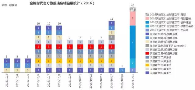 (數(shù)據(jù)來源:ECdataway數(shù)據(jù)威) 母嬰品牌玩轉(zhuǎn)營銷,提升銷量 除了品牌實(shí)力之外,營銷玩法也是各大品牌斬獲良好業(yè)績的強(qiáng)大推手。不管是在預(yù)售期還是雙十一當(dāng)天,全棉時代均取得了行業(yè)內(nèi)銷售額第一,在雙十一當(dāng)日8小時內(nèi)即突破2億銷售額,最終全天實(shí)現(xiàn)2.6億的突破。 從2016年10月21日起,全棉時代陸續(xù)推出“預(yù)售驚喜”、“show場進(jìn)店有禮”、“棉show現(xiàn)場直擊”等活動,在淘寶首頁、天貓首頁和雙十一主會場多次以焦點(diǎn)圖、通欄的形式上線店鋪鉆展,此外,在雙十一當(dāng)天上線全店五折棉show主題活動,同時通過優(yōu)惠券、抽獎活動、滿減等玩法,刺激消費(fèi),引爆雙十一熱潮。 全棉時代官方旗艦店店鋪鉆展統(tǒng)計(jì)(2016年)