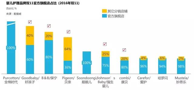 不只是品牌方,天貓平臺也在去年推出雙十一狂歡城玩法,以3D立體形式讓消費(fèi)者沉浸其中,一邊預(yù)覽節(jié)日活動信息,一邊暢玩尋寶游戲,同時還能進(jìn)店參與互動贏取紅包禮品等。今年,天貓雙十一晚會將賦能商家,打造新零售奧運(yùn)會,由品牌自定義內(nèi)容和節(jié)目,提供類似于“奧運(yùn)8分鐘”的品牌展示渠道,將優(yōu)質(zhì)品牌展示給全網(wǎng)消費(fèi)者們,此舉也將帶來品牌方銷售額的直接轉(zhuǎn)化。 分銷渠道占比較大,品牌需嚴(yán)格管控促銷形式 嬰兒護(hù)理品牌雙十一官方旗艦店與分銷對比 (2016年)