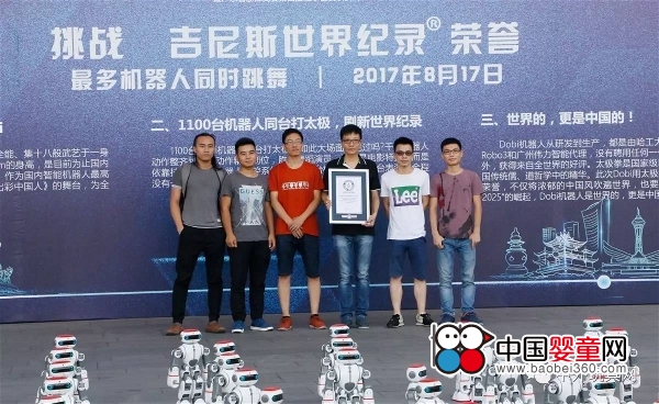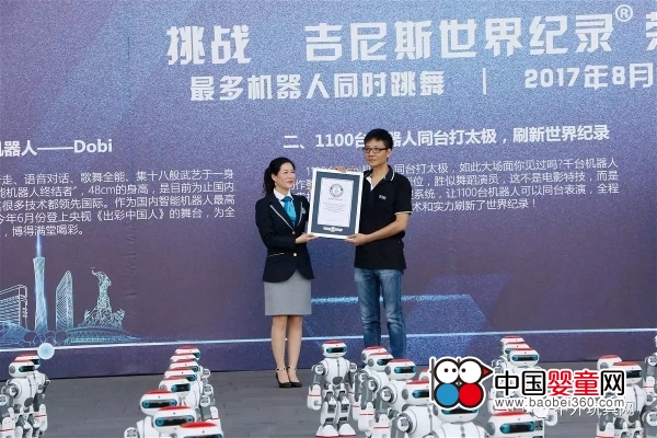 8月17日上午,偉力玩具有限公司在廣州白云國際會議中心成功挑戰“最多機器人同時跳舞”的吉尼斯世界紀錄。 在吉尼斯世界紀錄認證官的見證下,伴隨著音樂,偉力玩具帶來的1100臺Dobi機器人(豆比機器人)同時起舞,石板磚地面為挑戰增加了不小的難度,期間有31臺機器人由于地面不平倒下退出,但最終仍有1069臺機器人堅持到最后,打破了此前1007臺機器人同時跳舞的紀錄,一項全新的吉尼斯世界紀錄也就此誕生。