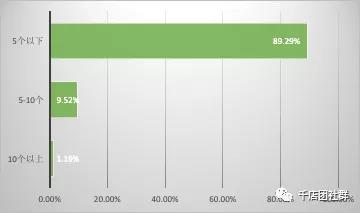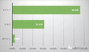 簡析:由以上數據可知,在參與調查的市區門店中,售賣5 個以下嬰幼兒護膚品品牌的門店占到66.23%,5-10 個品牌的占了大約三成,10 個品牌以上的僅有2.6%。這說明10 個嬰幼兒護膚品品牌,即能滿足絕大多數市區母嬰店的需求,現在市場上品牌越來越多,母嬰店可以廣撒網多嘗試。 2、貴門店目前正在經營的嬰幼兒護膚品品牌有幾個?(鄉鎮店)