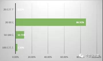 簡析:由以上數據可知,在參與調查的鄉鎮門店中,售賣5個以下嬰幼兒護膚品品牌的門店占到將近九成,5-10 個品牌的占了大約一成,10 個品牌以上的僅有約1%。由于鄉鎮市場消費水平有限,消費層次和質量比城市低,嬰幼兒護膚品品類也較少,5個以下品牌即能滿足絕大多數門店和消費者的需求。隨著鄉鎮市場消費能力和消費需求的提升,對嬰幼兒護膚品品類要求也會增多,母嬰店要提前做好準備。 3、貴門店嬰幼兒護膚品的單價一般是多少?(市區店)