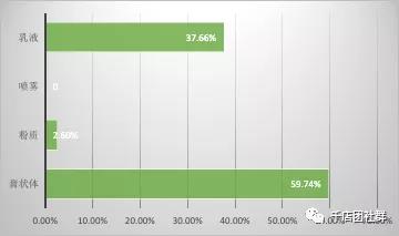 簡析:由以上調查數據可知,在參與調查的市區母嬰店中,膏狀體和乳液型的嬰幼兒護膚品賣的最好,二者占比達到97.4%,粉質的占2.6%,噴霧的沒有。嬰幼兒護膚品類型中,膏狀體和乳液型的使用較方便,也是傳統類型,大多數消費者已經習慣。母嬰店在售賣中應以膏狀體和乳液型為主,結合實際情況適量引入粉質型。 10、貴門店嬰幼兒護膚品以下哪種類型賣的最好?(鄉鎮店)