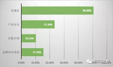 簡析:由以上調查數據可知,在市區母嬰店中,顧客在選擇嬰幼兒護膚品時最看重效果,約占一半,看重安全性的占23.38%,品牌知名度的占15.58%,最看重價格的占一成多一點。作為一種功能性產品,嬰幼兒護膚品主要用于嬰幼兒皮膚保護,效果自然是消費者最看重的。除此之外,安全性也是一個重要原因,母嬰店在向消費者推薦產品時應重點突出功效,其次則是安全。 8、貴門店消費者在選擇嬰幼兒護膚品時最看重什么?(鄉鎮店)