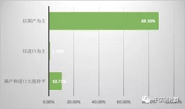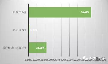 簡析:由以上調查數據可知,與市區店相比,鄉鎮母嬰店的情況同樣如此,膏狀體和乳液型的嬰幼兒護膚品最受消費青睞,尤其是膏狀體,占了將近七成。不同的是,鄉鎮母嬰店噴霧型的嬰幼兒護膚品突破了零,占3.57%,說明噴霧型產品在鄉鎮市場有一定市場,母嬰店可根據自身實際情況進貨。 11、貴門店嬰幼兒護膚品品牌以國產還是進口為主?(市區店)